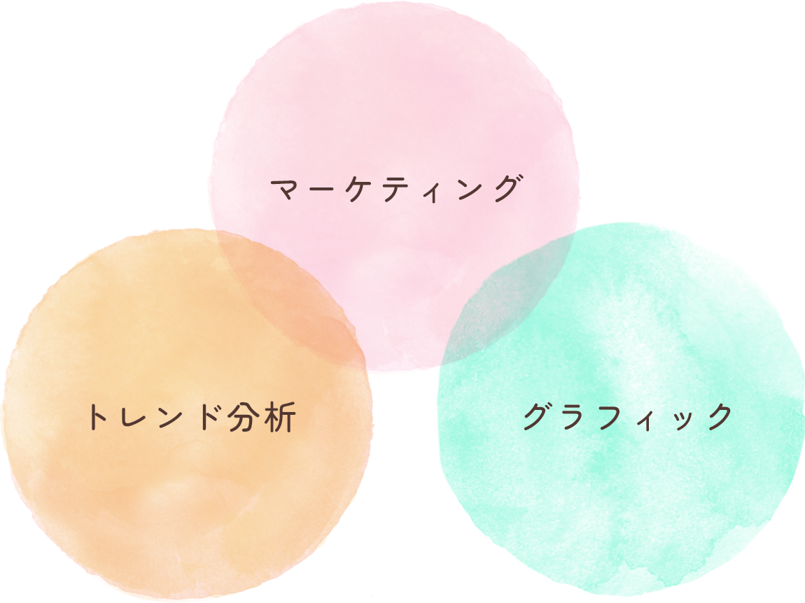 アスコットの強みは、独自の「ダイレクトマーケティング」「トレンド分析」「グラフィック」による商品開発です。